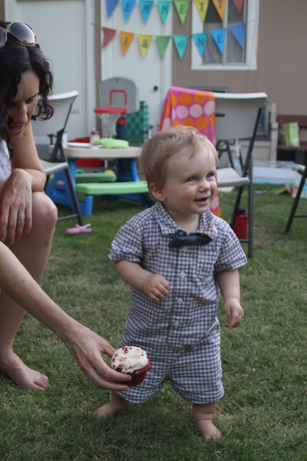 We kept it simple and had chicken, hot dogs, salad, potato salad, fruit salad, and chips and goldfish for dinner. I got some delicious cupcakes from Bella Rose Bakery (seriously, they are to die for) and Clarita picked out a red velvet one for Emmett. Unfortunately Buggle was not in the best mood. I had to wake both him and Clarita up from their naps (Bayleaf refused to take a nap) and he was kind of fussy. He only wanted me to hold him and wouldn't even touch his cupcake or eat anything aside from goldfish. I think he may have been a little overheated. He was red and as soon as the soon went down and it started to cool off he perked up and started playing happily.